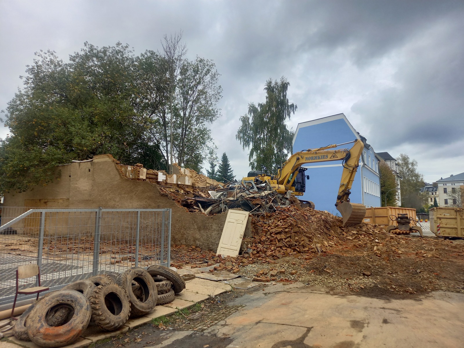 Die beiden verbliebenen Gebäude vom Kaufland-Parkdeck aus gesehen; das linke Gebäude wird vom Bauhof der Stadt Greiz genutzt, das andere von den Vogtlandwerken.