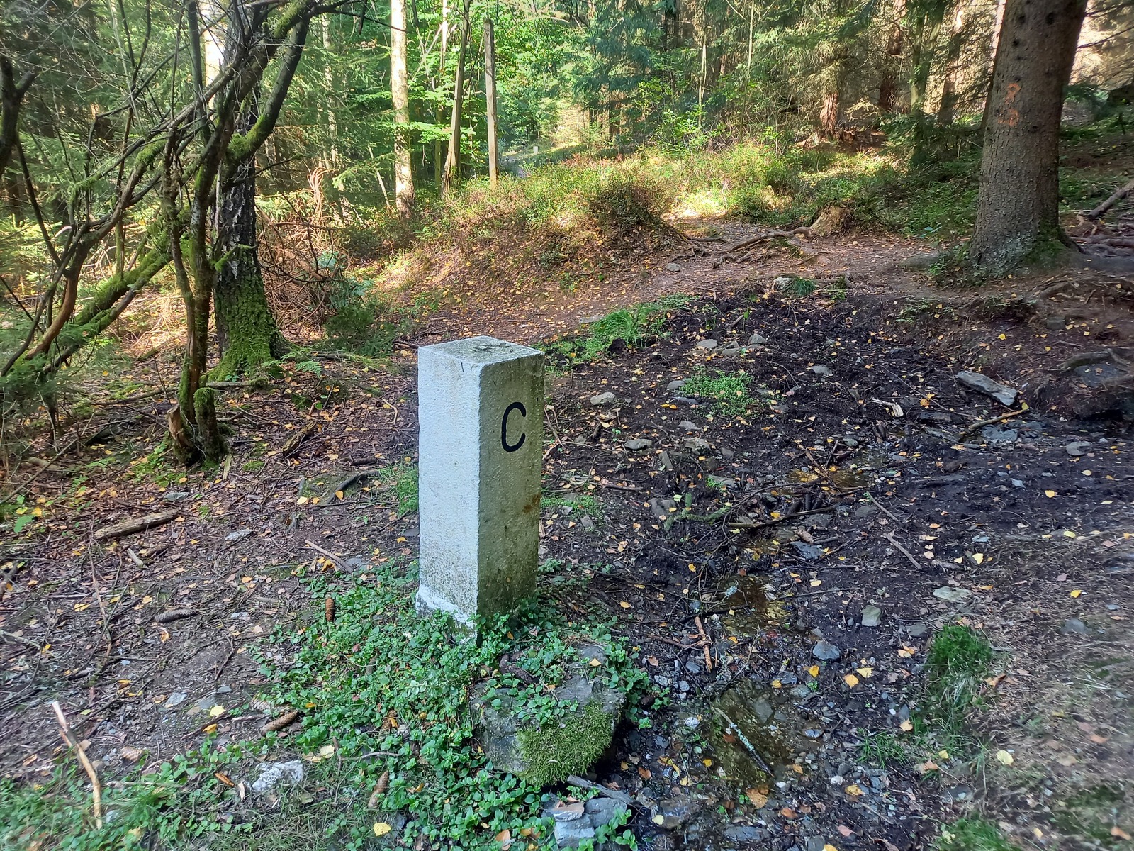 tschechischer Grenzstein am Hirschleckenweg; in dessen Mitte verläuft die Grenze