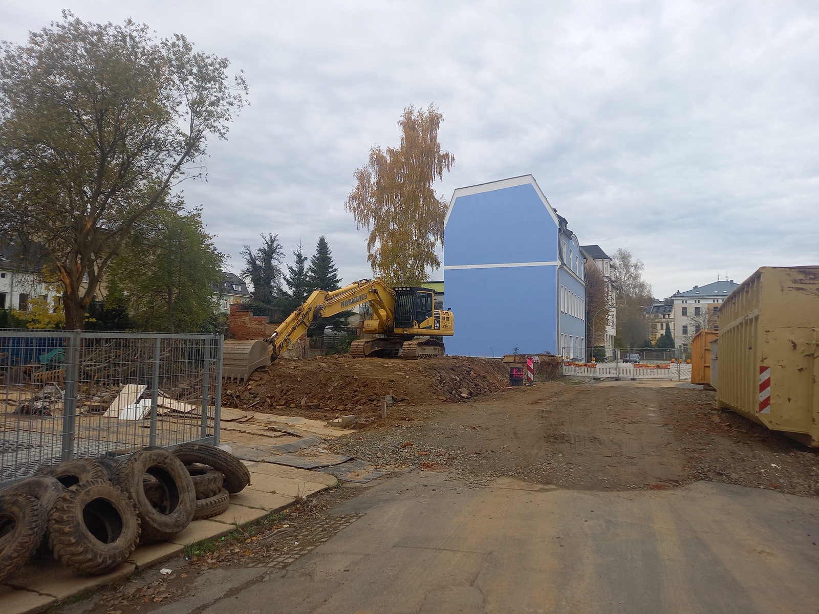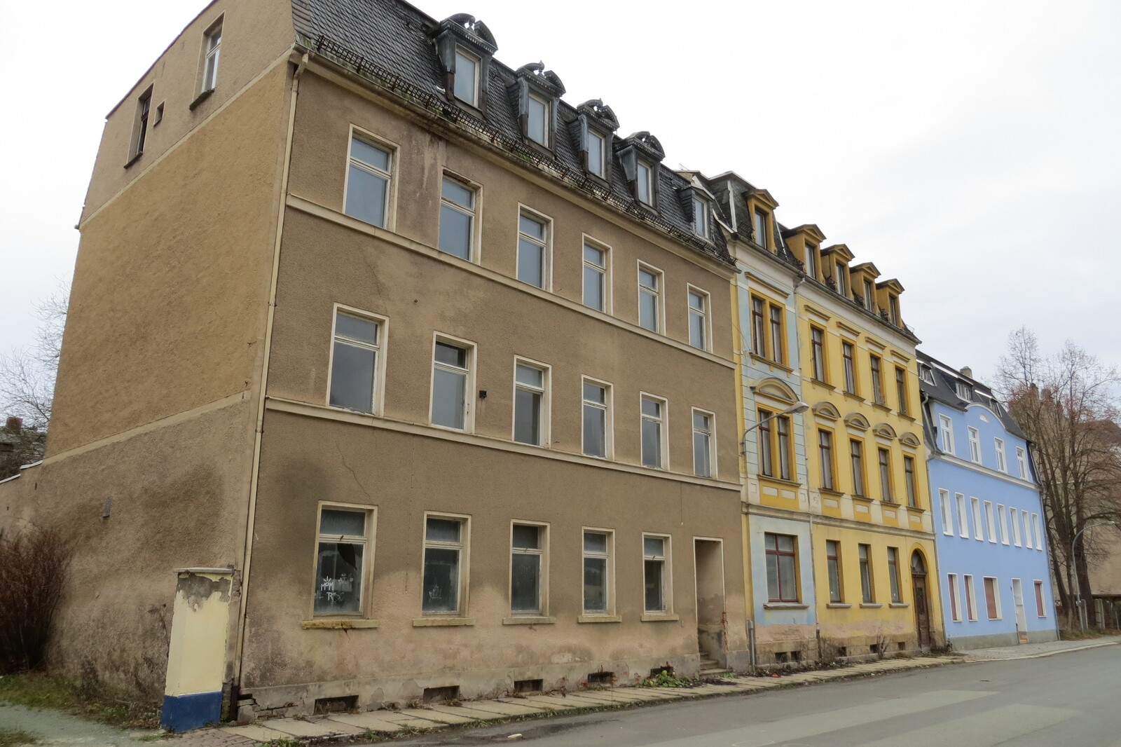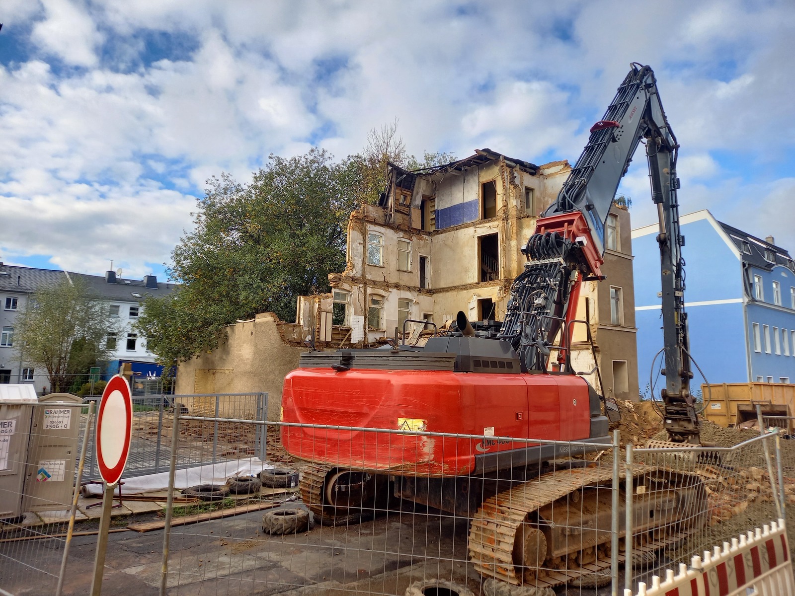Die beiden verbliebenen Gebäude vom Kaufland-Parkdeck aus gesehen; das linke Gebäude wird vom Bauhof der Stadt Greiz genutzt, das andere von den Vogtlandwerken.
