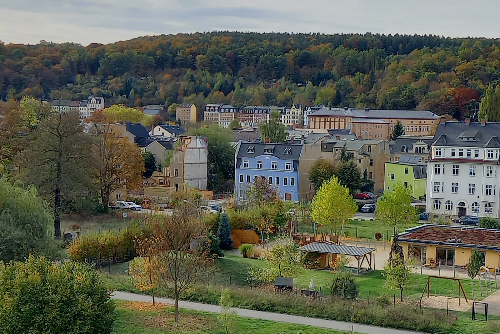 Blick vom Hainberg in Richtung Pohlitz; links das Gelände des ehemaligen TVW, rechts das ehemalige Fabrikgebäude der Gebrüder Albert
