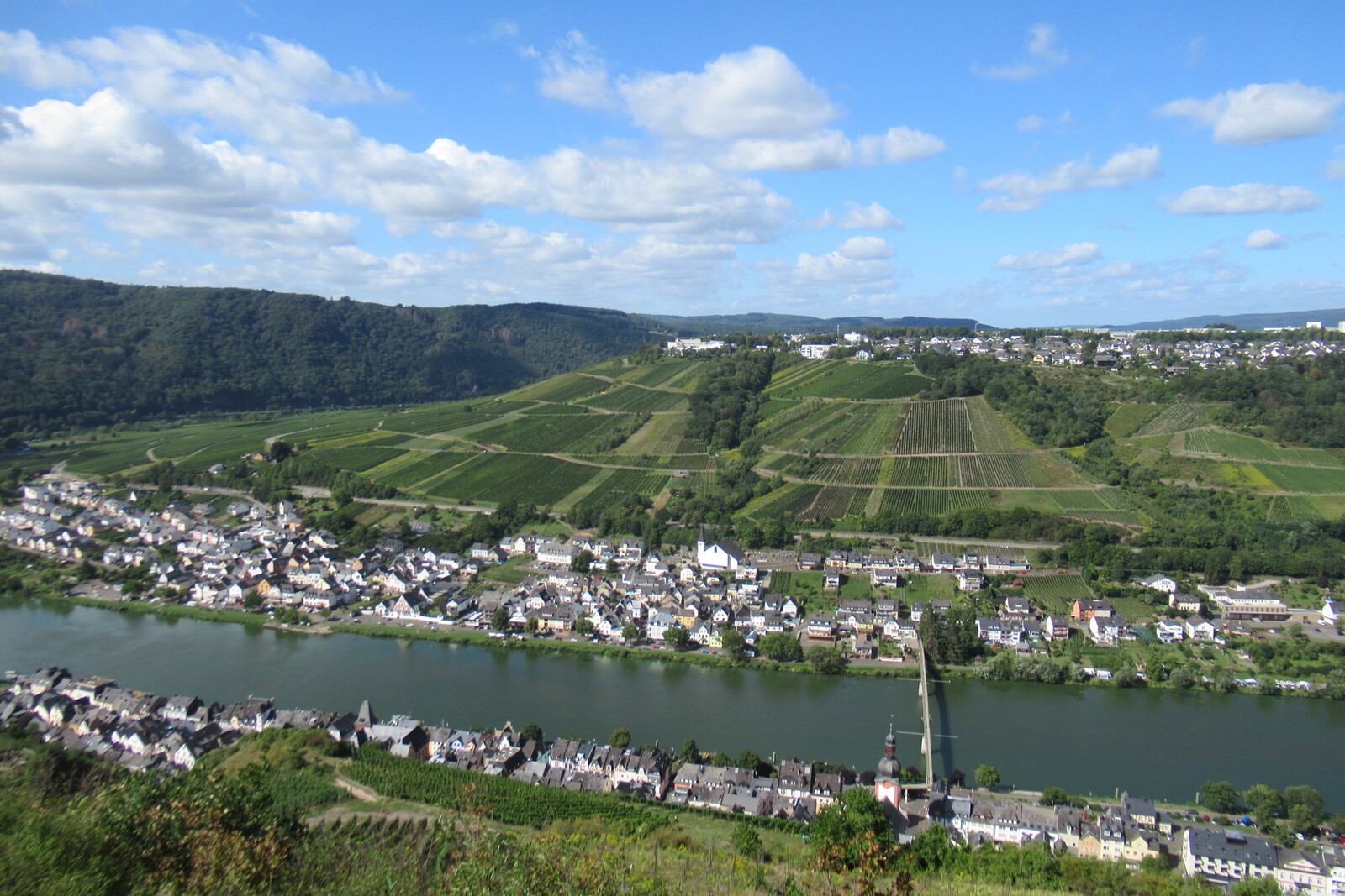 Blick von der Bismarckhütte bei Starkenburg moselabwärts; vorn Traben, hinten Enkirch