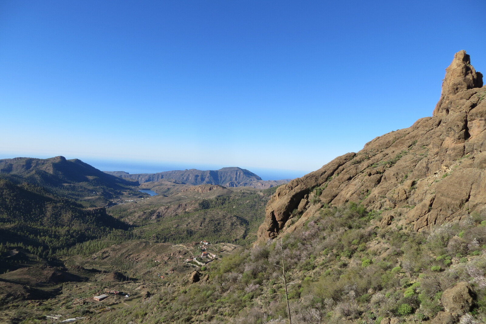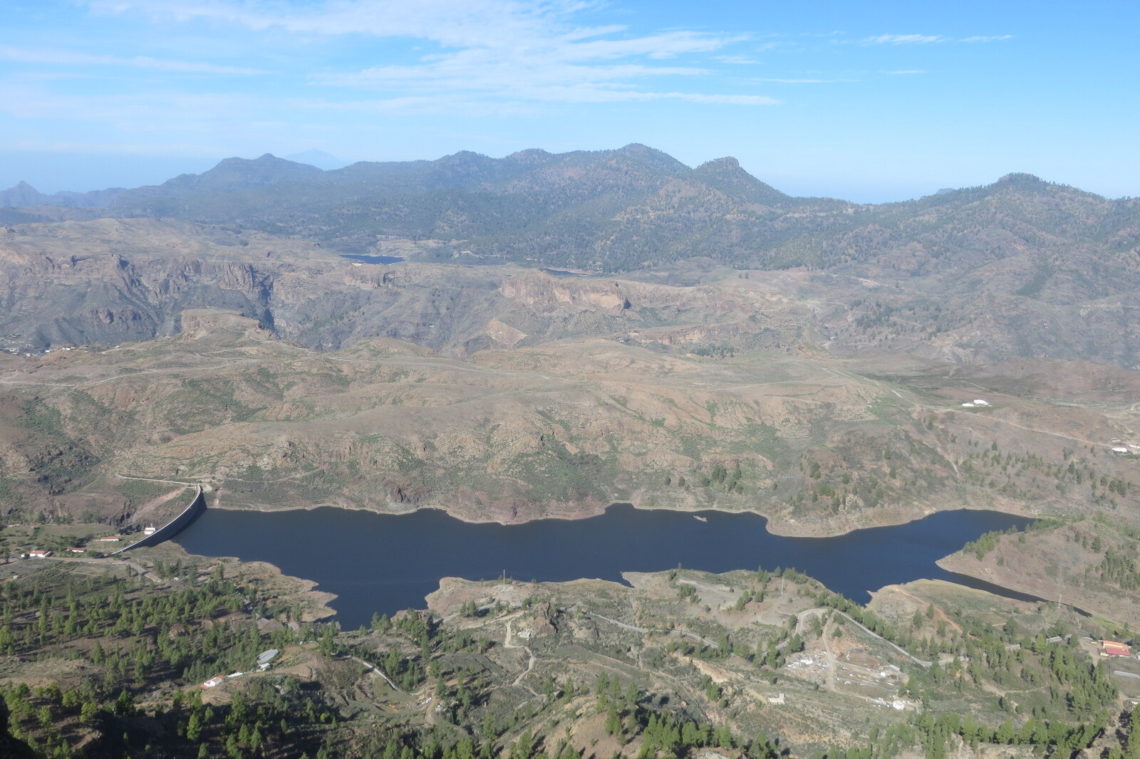 Blick vom Weg von Cruz Grande zum Ventana del Nublo über den Stausee Chira zum Meer