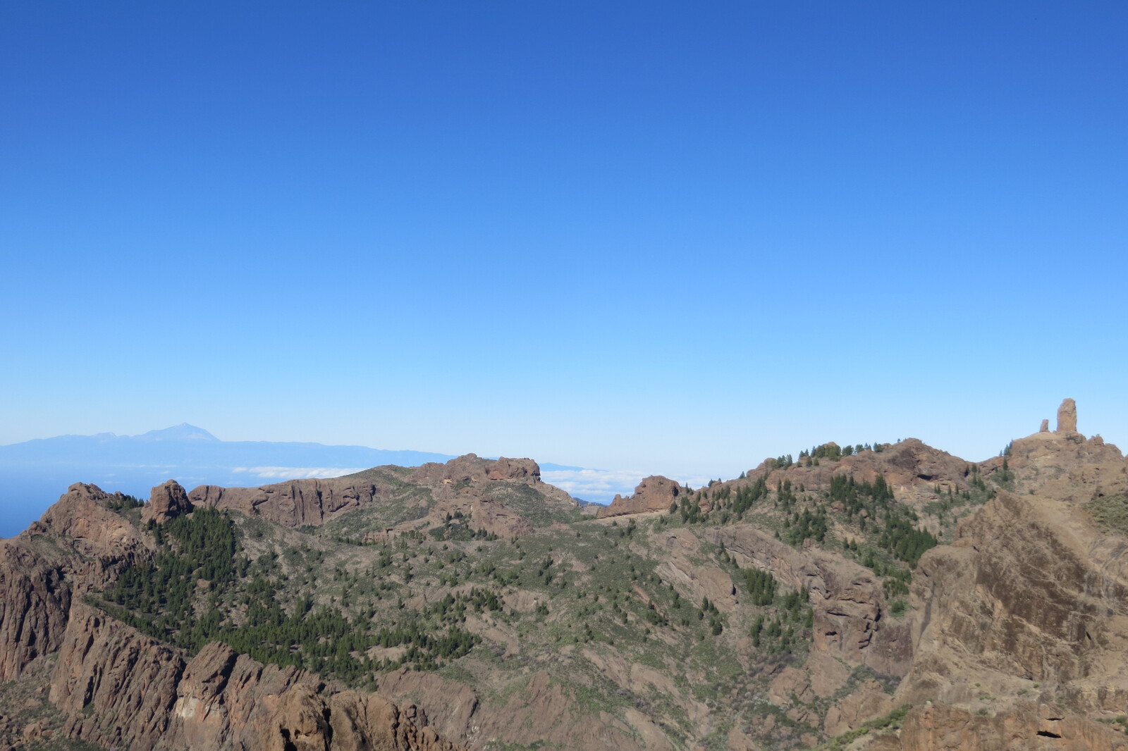 Blick vom Weg zwischen Degollada de los Hornos und Pico de las Nieves zum Roque Nublo und Pico del Teide