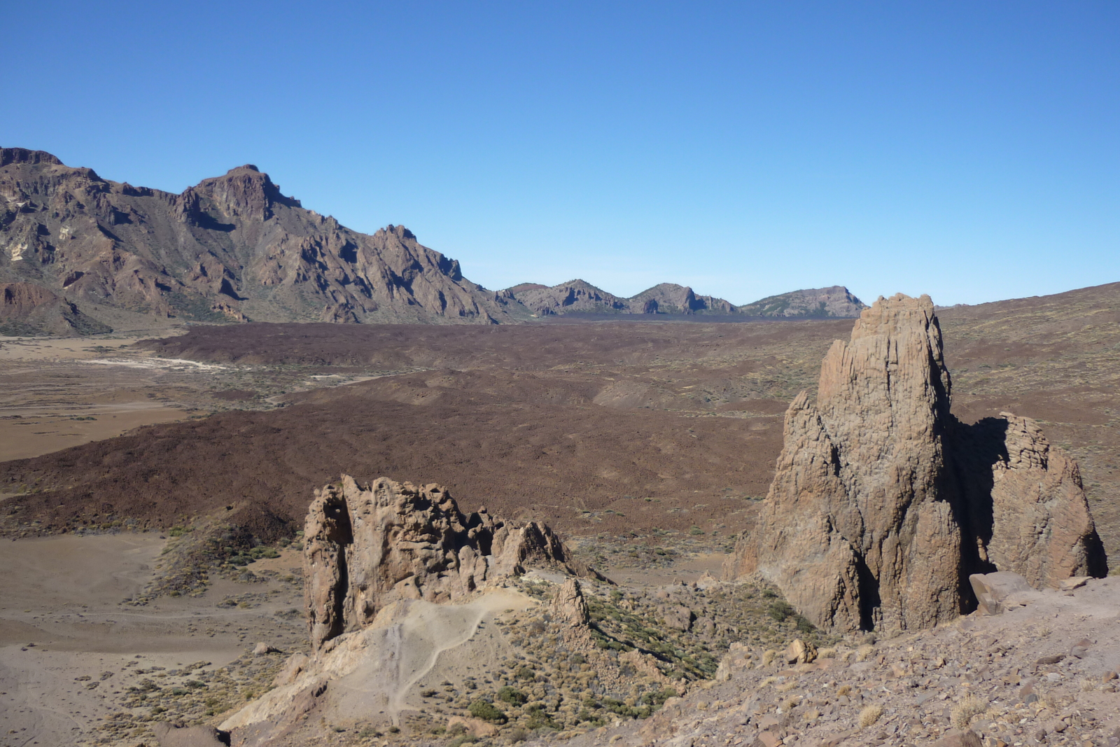 Blick vom Ventana del Nublo zum Roque Nublo (rechts) und Pico del Teide (links)
