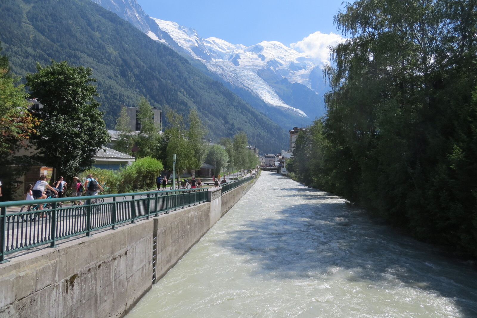 die Arve in Chamonix, Mont-Blanc-Massiv im Hintergrund